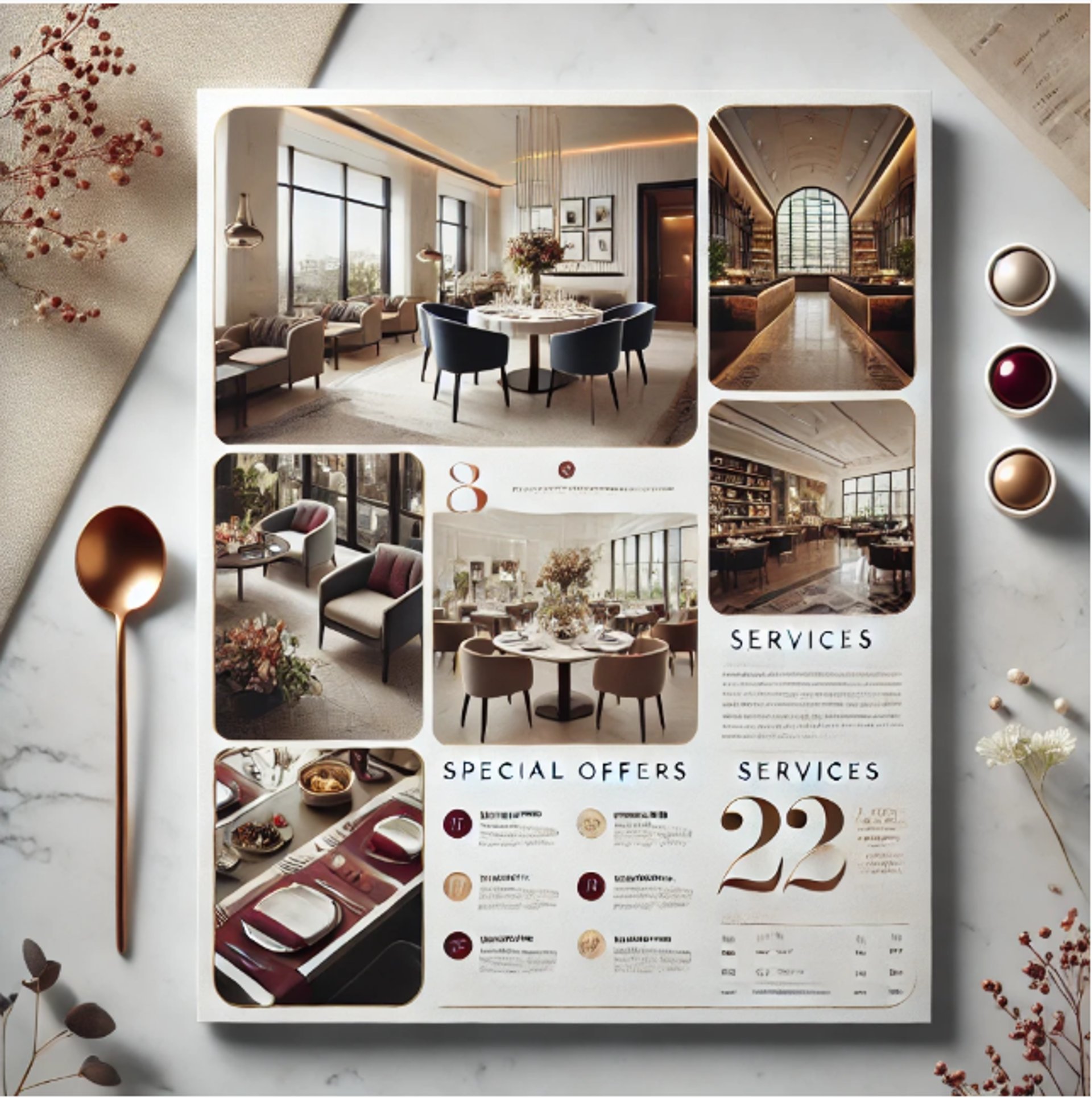 Ce modèle met en avant des images vibrantes de gastronomie et d'intérieurs d'hôtels élégants.